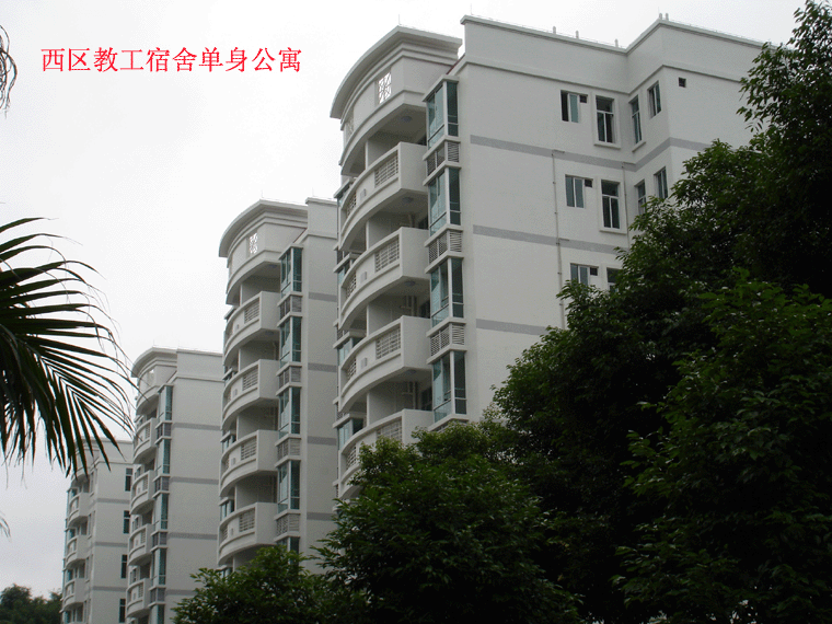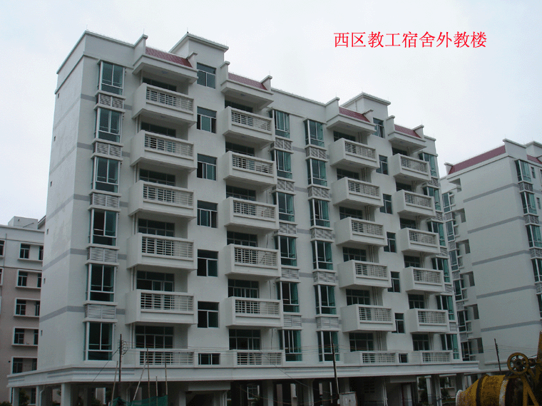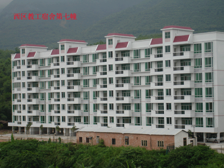 由肇庆市建筑设计院有限公司设计、汕头市建筑工程总公司承建的学校西区教工宿舍第七幢已于2005年5月12日竣工验收。该幢教工宿舍建筑面积为5243平方米(图)。 由肇庆市建筑设计院有限公司设计、广东梁良建筑工程有限公司承建的学校西区教工宿舍外教楼、单身公寓已于2005年6月10日竣工验收。该宿舍建筑面积为6090平方米(图)。