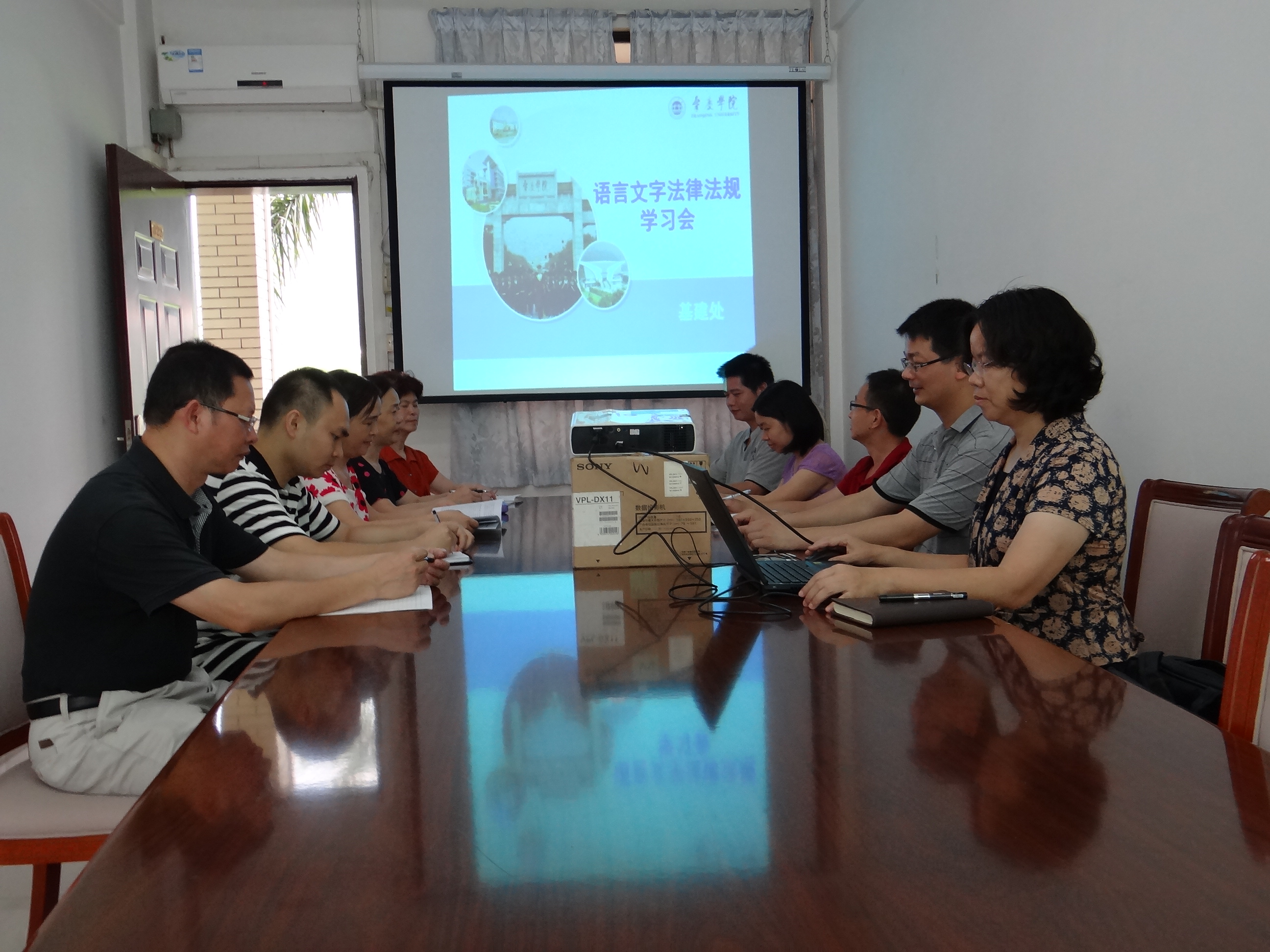 根据《肇庆市迎接广东省二类城市语言文字工作评估实施方案》的工作部署,基建处于2015年5月15日,组织全体职工学习《语言文字法律法规学习读本》(简称《读本》)。